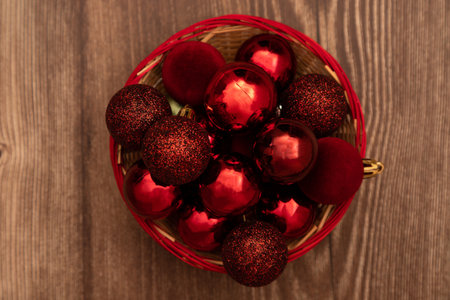 Festive flat lay with a wicker basket filled with shiny and matte red Christmas baubles on a wooden surface. Cozy rustic background perfect for holiday cards, invitations, and winter designs.
