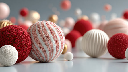 A visually stunning arrangement of decorative 3D Christmas ornaments in vibrant red, white, and gold colors, creating a warm festive atmosphere.