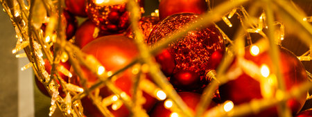 Banner close up of red Christmas balls baubles. Bokeh garlands. Xmas and holidays concept. Copy space and empty place for text, mock up greeting card