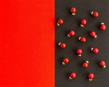 Classic red glass baubles balls with glitter on red and black concept background. Christmas ornaments background.