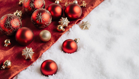 Christmas background with red and golden baubles on snow with copy space
