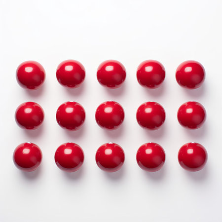 close-up image showcasing a row of red balls arranged on a dark podium. The balls are textured and evenly spaced, creating a visually appealing composition against a blurred background.