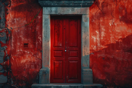 Bold red door set within a weathered, redpainted wall, creating a dramatic and mysterious entrance
