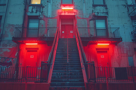 Stark red-lit stairway leading to a building entrance, creating a dramatic urban ambiance at night.