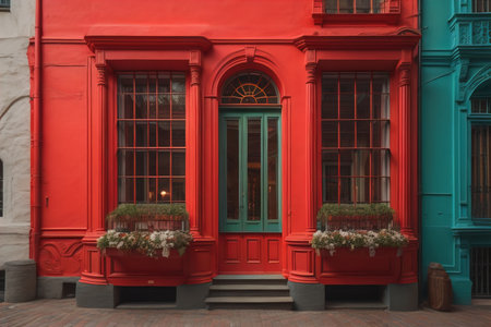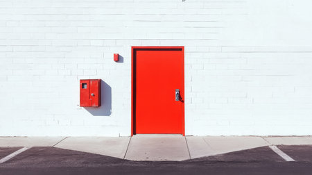 A striking red door and matching mailbox stand out against a pristine white brick wall, creating a captivating urban scene full of color and minimalism.