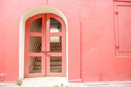 Old wooden red brown color vintage door with metal rivets. Close up architectural detail