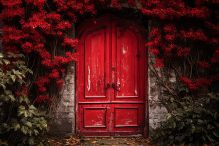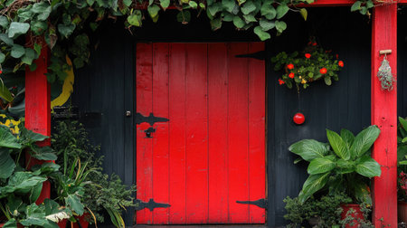 A striking rustic red door surrounded by lush greenery, symbolizing charm and tranquility in a farmhouse setting. Perfect for eco-friendly themes.