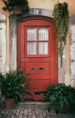 Typical Lisbon old red door decorated with pots of plants in Bica Neighborhood