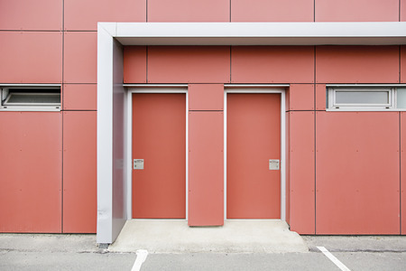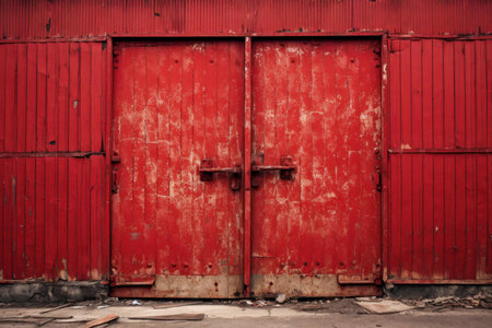 A striking image of a bold red industrial door set against a textured metal wall, highlighting urban design and architectural elements with vivid color contrasts.