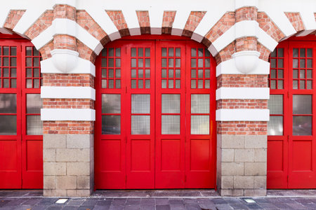 London, UK - October 17, 2021: Traditional red front doors on an apartment block in Victoria Buildings in Southwark, London. Bright coloured doors are a popular feature of home in the capital.