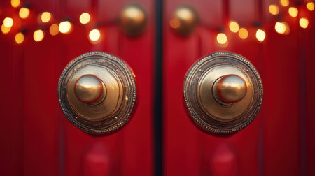 Two ornate door knobs are mounted on a vibrant red door, illuminated by soft lights, creating a striking and inviting entrance.