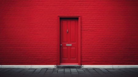 Features a vibrant red door flush against a textured red wall with subtle light play. Adds visual interest with its minimalist architectural design.