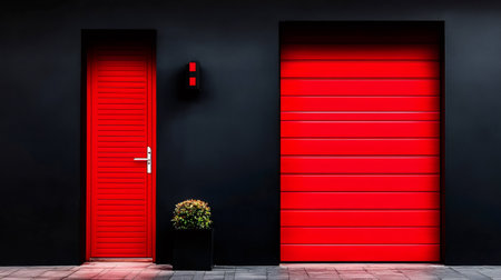 Red garage door and pedestrian door create a vibrant contrast against a sleek black wall, adding a modern and stylish touch to the building's exterior