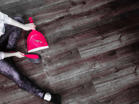 Cleanup housework concept. Closeup cleaning woman sweeping wooden floor with red small whisk broom and dustpan indoor