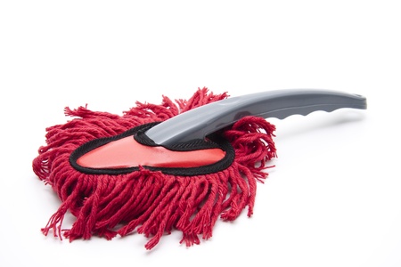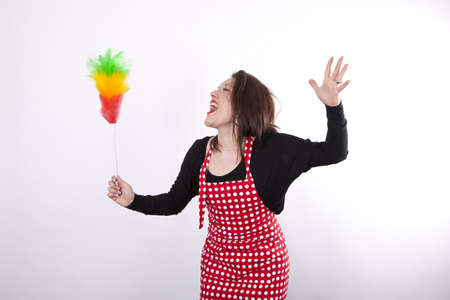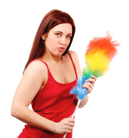Sexy woman in red shirt with whisk for house dust isolated on white background