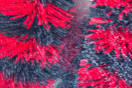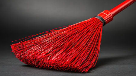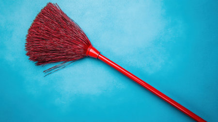 Broom red sweeping brush against blue and white cloudy sky. Household obejcts concept.