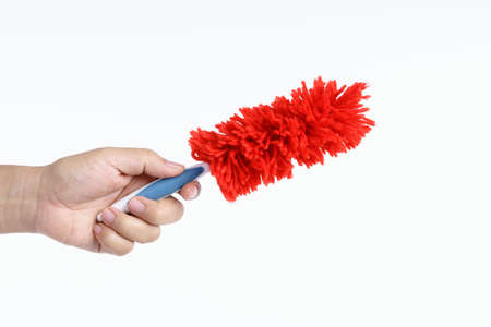 Spring cleaning concept. Hand with soft magenta duster, synthetic feather broom. Woman hand holding a duster clean. The concept of cleaning service