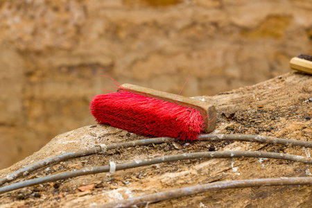A worn cleaning brush with vivid red bristles rests atop a weathered wooden beam, surrounded by scattered dust and electrical cables. The composition highlights utilitarian work tools and textured construction materials in a rustic setting.