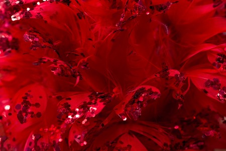 Christmas and New Year decorations: background of red feathers and sparkles, soft focus.