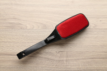 Cleaning house or office concept. Wooden clothes brush with red bristles on a white wooden table, close up, top view