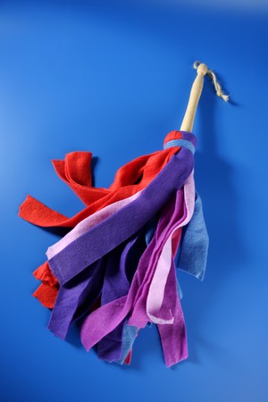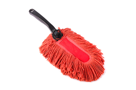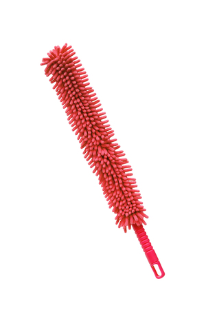 Broom for cleaning or soft colorful duster with plastic handle, isolated on white background