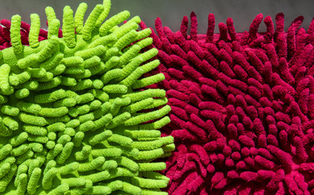Mops of different colors. Cleaning equipment. The concept of cleaning, restoring order in the house and on the street. Plastic cleaning brushes. The mops stand with their bristles up.