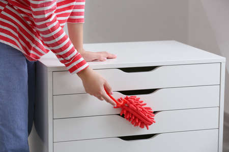 Closeup young woman woman dusting shelf, cleaning her house. Chores and hygiene concept.