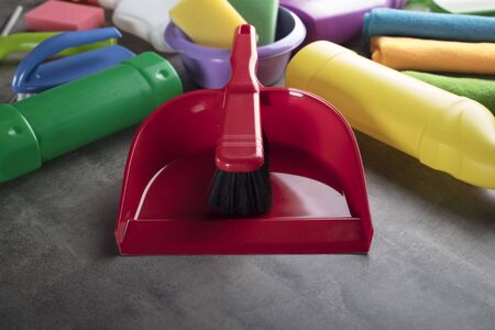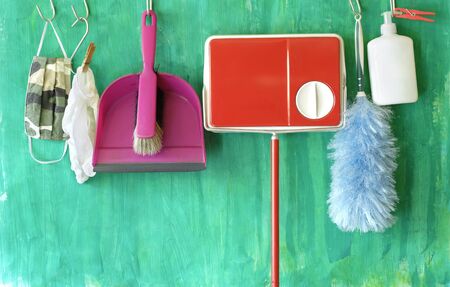 House cleaning in times of coronavirus, face mask,gloves,germicide, cleaning utensils,concept,good copy space