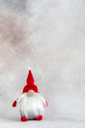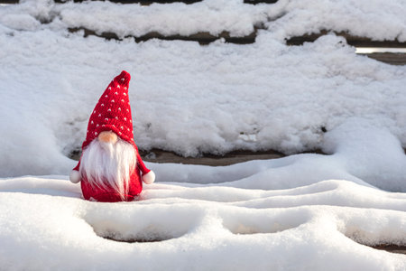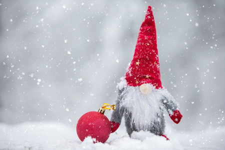 Christmas gnome on snowy and shiny background with copy space
