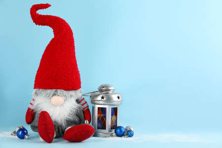 Cute Christmas gnome, festive balls and lantern on light blue background. Space for text