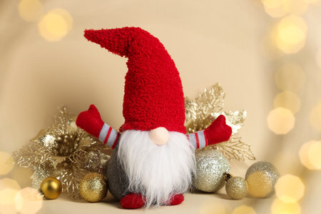 Funny Christmas gnome and festive decor on beige background with blurred lights, closeup