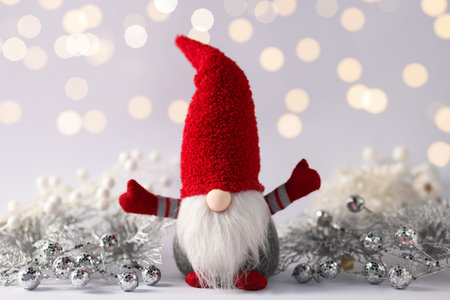Funny Christmas gnome and festive decor on light gray background with blurred lights