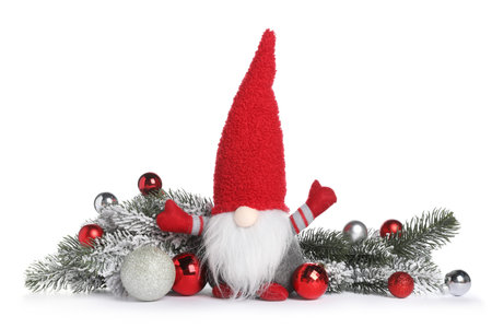 Funny Christmas gnome and festive decor isolated on white