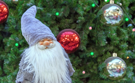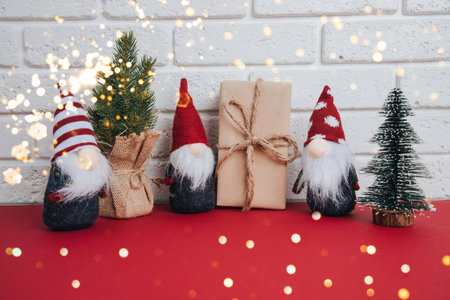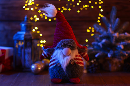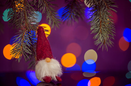 Christmas toys and Christmas gnome on a background of defocus lights