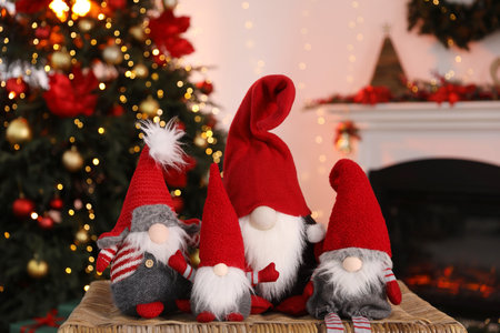 Cute Christmas gnomes on wicker box against blurred lights indoors, closeup
