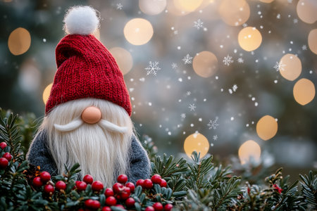 Festive christmas gnome with red hat and white beard amidst evergreen branches and snowflake lights