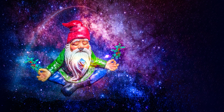 santa dwarf meditating in space with holly holding branches in his hand