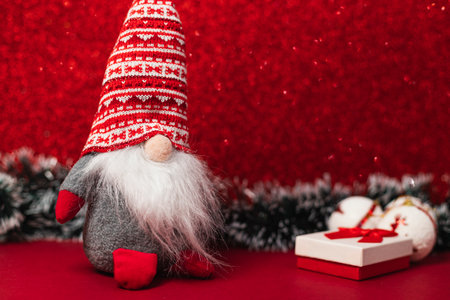 Red Christmas gnome on an unfocused background with bokeh effect, close-up selected