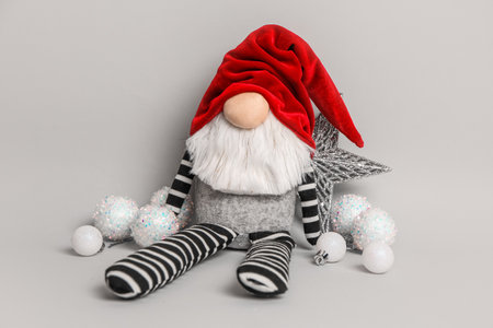 Funny Christmas gnome and decorations on gray background