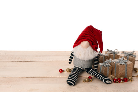 Christmas gnome with gift boxes and balls on beige wooden table against white background