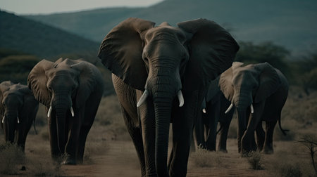 Family of elephants walking through the savannah at sunset. Amazing African wildlife. Generative AI