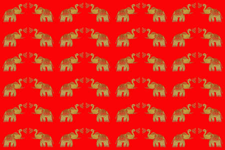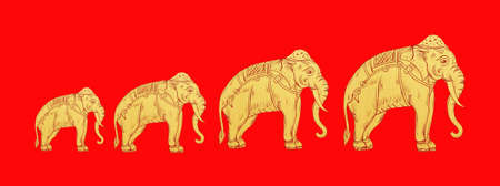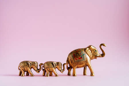 Golden elephant figurines on a pink background. A family of Indian elephants. Sacred animals in India. Luck and stability in the house by elephant's energy. high quality photo