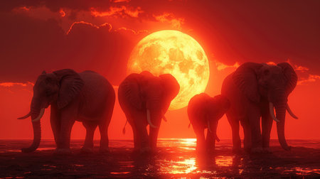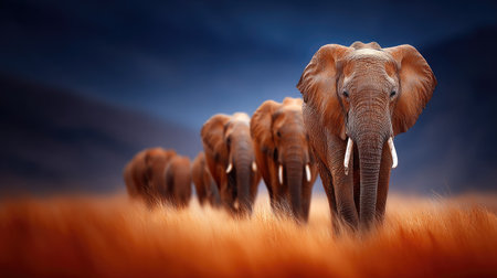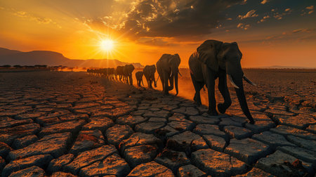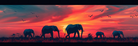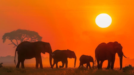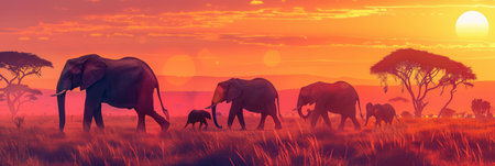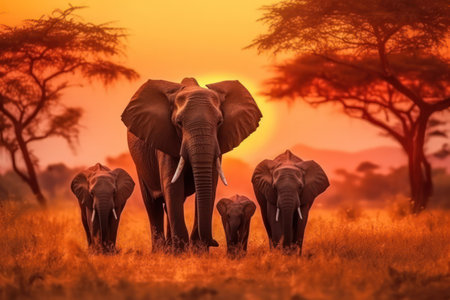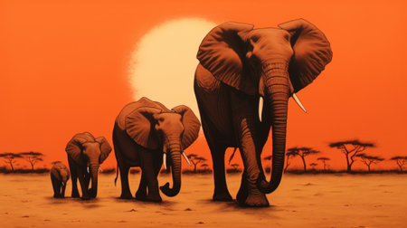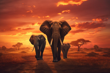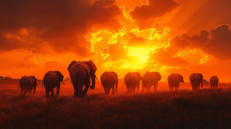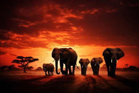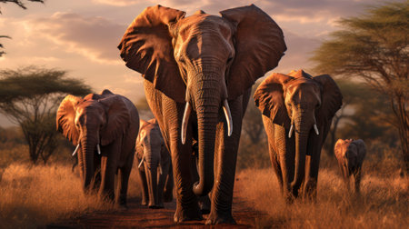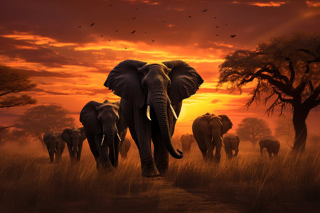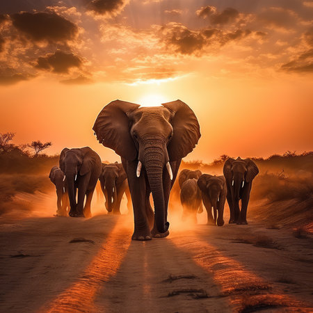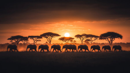 Majestic elephants marching across the African savanna during a breathtaking sunset