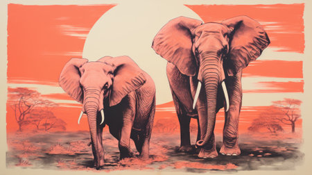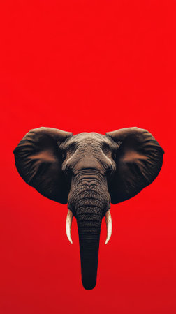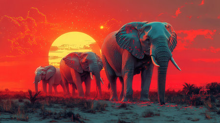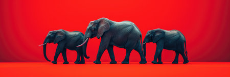 Three elephants stroll across a vibrant red background, symbolizing family unity and strength. The largest elephant leads the way with its trunk raised confidently, while a younger companion follows closely behind, portraying a sense of protection and guidance. The backdrop adds a striking contrast to their gray skin, emphasizing their majestic forms.