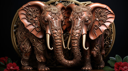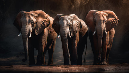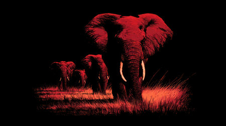 This image features a group of elephants, vividly rendered in red against a deep black backdrop. The composition showcases the animals in a frontal arrangement. The lighting creates strong shadows. Suitable for various creative projects, the image has potential for commercial uses.