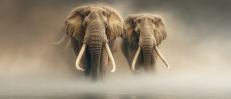 Two elephants walk through shallow water surrounded by mist capturing a serene atmosphere at dawn. Their majestic presence is highlighted.