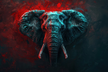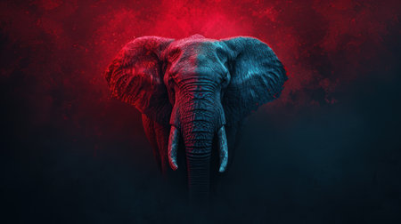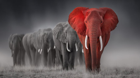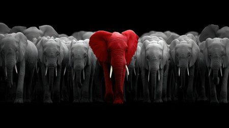 An image showcases a solitary red elephant positioned prominently within a crowd of gray elephants against a stark black backdrop. The composition features contrasting colors and textures, creating a striking visual effect. This image could be used for various commercial or editorial purposes, conveying themes of individuality and leadership.