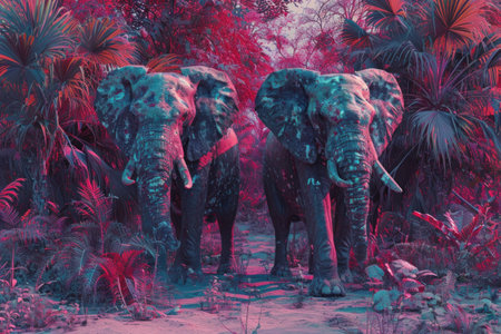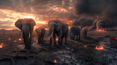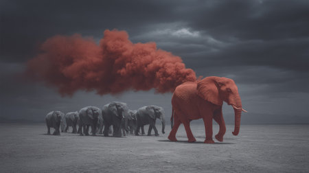 This conceptual image depicts a herd of elephants, with one standing out in a vibrant red hue and smoke. The composition features a moody, overcast sky. It may be suitable for illustrating themes such as change, leadership, or environmental issues. The image's surreal qualities offer potential use for a variety of creative projects.