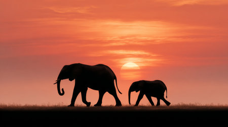 Two magnificent elephants, one adult and one juvenile, stroll gracefully against a stunning sunset backdrop featuring vibrant oranges and pinks.