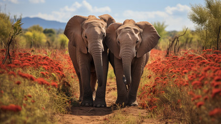 Two red elephants confronting each other amidst a clash in the african savannah landscape